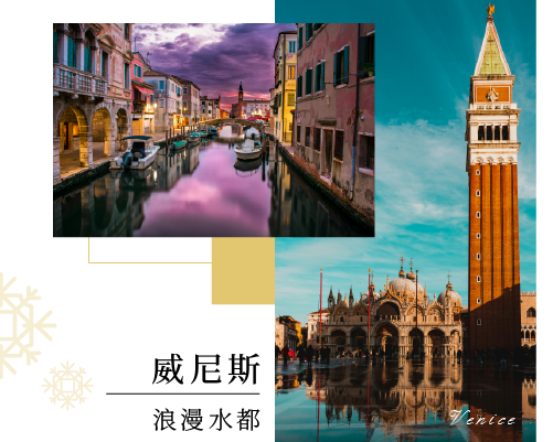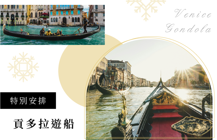 人生必去100個景點之一,沒有馬路、沒有汽車,只有彎曲的水道,和來往繁榮的船隻,城內400多座風格迥異的橋樑就是水上唯一的「路」。特別安排貢多拉遊船,穿梭於400多座拱橋最浪漫的遊覽方式。