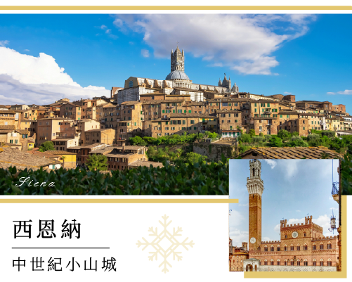 下車參觀:西恩納—田園廣場、曼加塔鐘樓(外觀)、錫耶納大教堂、聖吉米尼亞諾