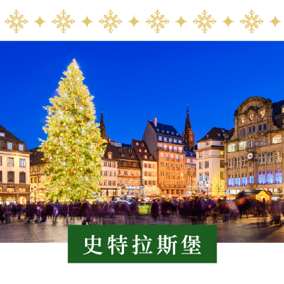 法國史特拉斯堡 Strasbourg 有「聖誕之都」的美譽,每到聖誕節,整座小鎮便化身為夢幻的童話世界。歷史悠久的布羅伊廣場聖誕市集(Christkindelsmärik)、點綴著 30 公尺高聖誕樹的克勒貝爾廣場、在伊爾河畔的魚市場廣場有道地的阿爾薩斯熱白酒,以及規模龐大的史特拉斯堡大教堂聖誕市集,共同打造出濃厚的聖誕氛圍。小鎮散落著 300 多個聖誕小木屋,每條街道有著不同且特色的聖誕燈飾,還有用泰迪熊裝飾的屋子。使特拉斯堡的聖誕節不僅只是聖誕市集,整個小鎮的建築與聖誕氛圍讓人陶醉。