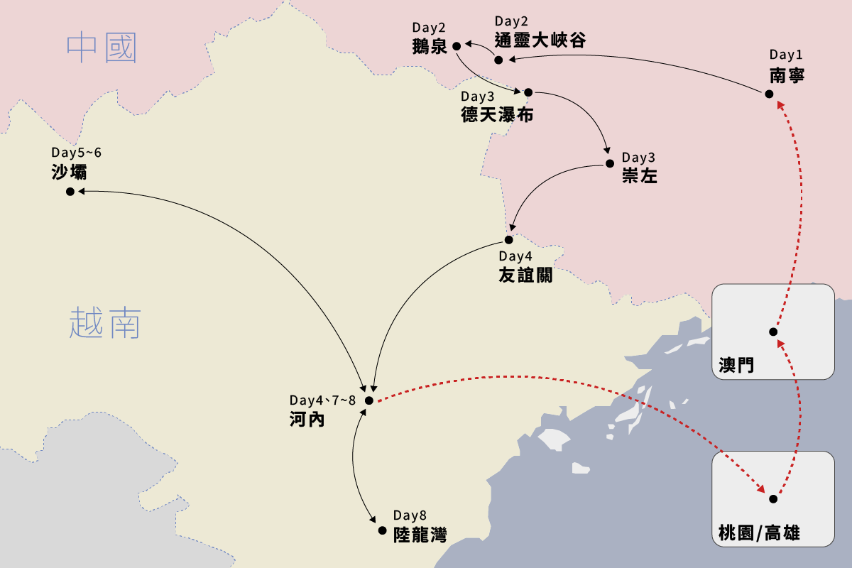 崇左─(車程約1.5HR)友誼關(含電瓶車)─(車程約3.5HR)河內~巴亭廣場~總督府~一柱廟~還劍湖~聖若瑟主教座堂~河內歌劇院~三十六古街(含電瓶車)