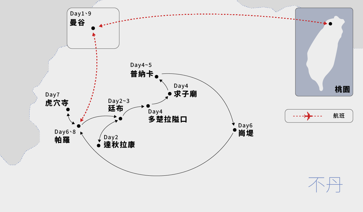 泰國曼谷/不丹帕羅(航班)→首都廷布→達秋拉康,鐵橋→廷布宗/扎西秋宗
