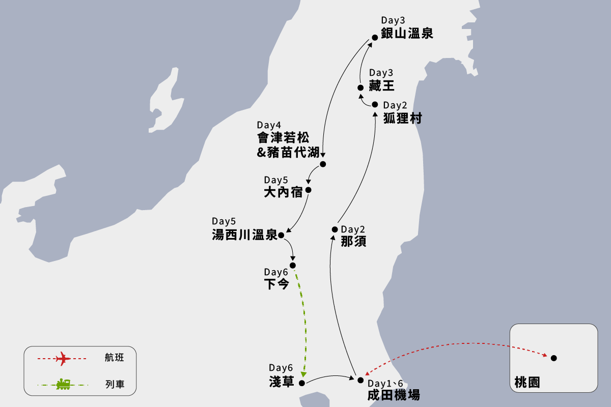 飯店→那須採草莓~冬日限定體驗(現採吃到飽) →山形藏王~狐狸村→山形鐵道「Flower長井線」
