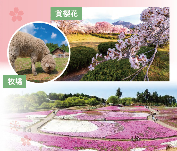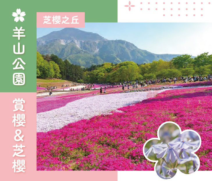 位於秩父的羊山公園,名字源自過去曾作為飼養羊隻的種畜場,如今園內仍保留著市營牧場,讓這片花景多了一分樸實的鄉野氣息。春天來到這裡,除了眾所皆知的芝櫻之外,也能欣賞梅花、櫻花、鬱金香等多種花卉,色彩繽紛、層次豐富。最受歡迎的「芝櫻之丘」佔地遼闊,超過 40 萬株芝櫻依著丘陵鋪展成粉紅、白色、淡紫交織的花毯,五彩亮麗的色塊一路延伸到山腳,是春季限定的壯觀景致。漫步在步道上,遠方能望見武甲山的山稜線,近處則是細緻柔軟的芝櫻花海,無論是遠拍大景或貼近欣賞,都能感受到芝櫻之丘的迷人魅力。園區位於地勢較高的位置,觀景台更能俯瞰整個秩父市區,是結合自然、花景與視野的一處春日散策好去處。