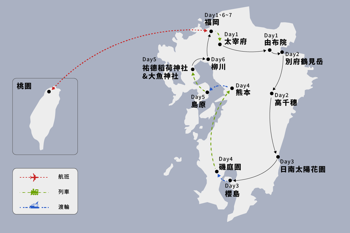 九州是位於日本西南端的島嶼,包括福岡縣、佐賀縣、長崎縣、熊本縣、大分縣、宮崎縣、鹿兒島縣等七個縣。九州是個旅遊非常便利的地方,可以體驗各縣和各地區間的差異,交通四通八達。一次旅行便可以感受到多種多樣的體驗。