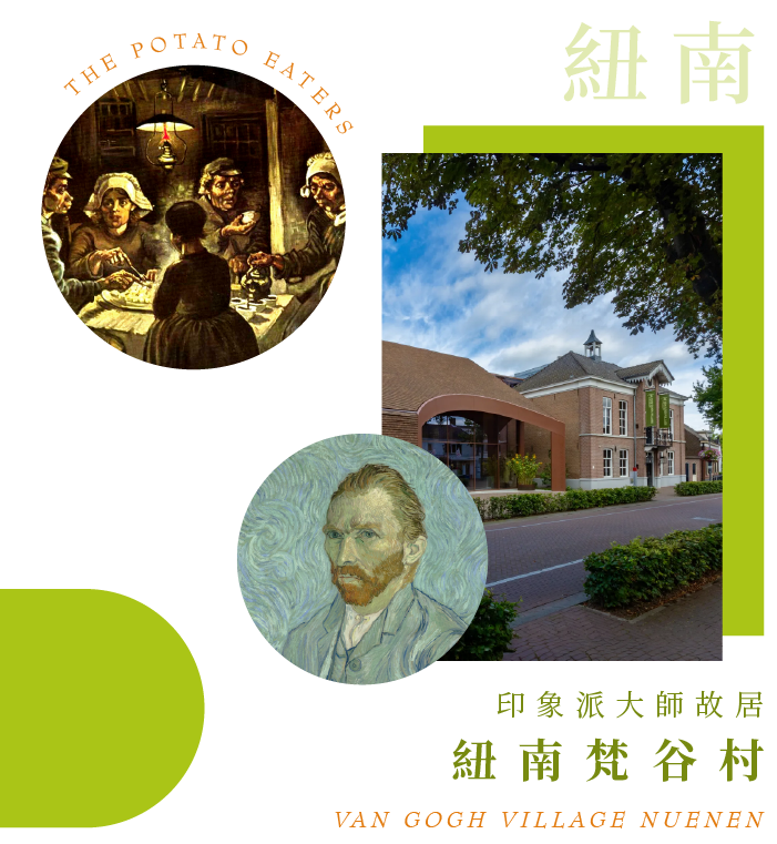 是一座浪漫氣息的小鎮,梵谷曾於1883~1885年生活於此,這裡的綠意盎然及鄉村純樸美景,激發了梵谷源源不絕的創作靈感,現今居民更樂於把這裡成為梵谷村,在這有著梵谷故居與畫室、畫過的大樹與教堂、他給弟弟寄信的郵局、他愛人的家,跟著梵谷曾經的足跡回復當年的模樣,感受他窮苦生活與充滿曲折的愛情路,梵谷成名作之一的《吃馬鈴薯的人》,也是在紐南生活期間創作完成。