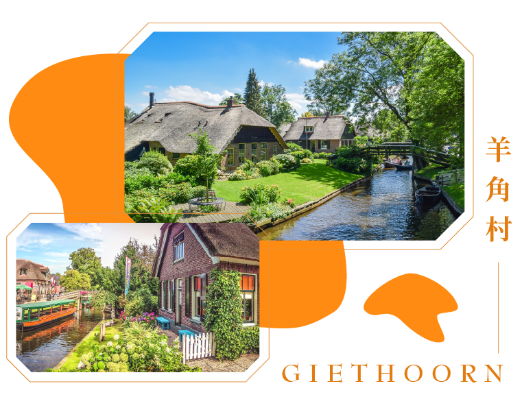 位於荷蘭西北方自然保護區內的羊角村;羊角村素有『綠色威尼斯』之稱,運河湖泊交織的美景中,一幢幢蘆葦屋頂的綠色小屋映照於水中美麗的倒影,是體驗小巧樸實的漁村風情最美麗的寫照。體驗羊角村最好的方式當然是來趟運河巡禮,安排乘坐平底船穿梭靜謐的村落,別有一番風情。