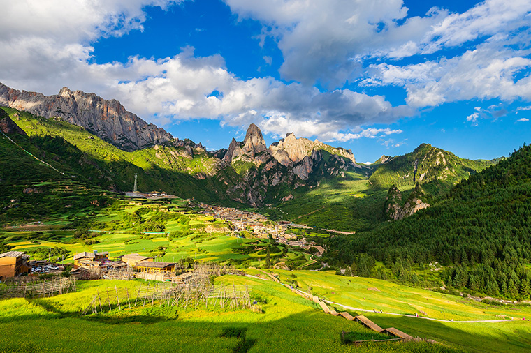 是一圈俏麗的崖壁包裹中的一個藏族小村寨,風景秀麗奇幻,是整個甘南藏區風光最為優美的地方之一。村中古老的木制藏居沿山而建,藏民們安靜淳樸的勞作在山坡河水之間,構成美妙的田園風光。"扎尕那"是藏語,意為"石匣子",是一座完整的天然"石城"俗有"閻王殿"之稱。地形既像一座規模宏大的巨型宮殿,又似天然岩壁構築的一座完整的古城。正北是巍峨恢弘、雄偉壯觀、璀璨生輝的光蓋山石峰,古稱"石鏡山"因灰白色岩石易反光而有其名;東邊聳峙壁立的俊俏岩壁,淩空入雲,雲霧繚繞;南邊兩座石峰拔地而起,相峙並立成石門;再南至東哇、納加一帶,峭壁矗立,清流跌宕,水磨飛輪,流轉不息。山勢奇峻、景色優美,猶如一座規模宏大的石頭宮殿,這片世外桃源雖然早在近百年前就被洛克譽為亞當和夏娃的誕生地,但至今仍是一塊處女地。