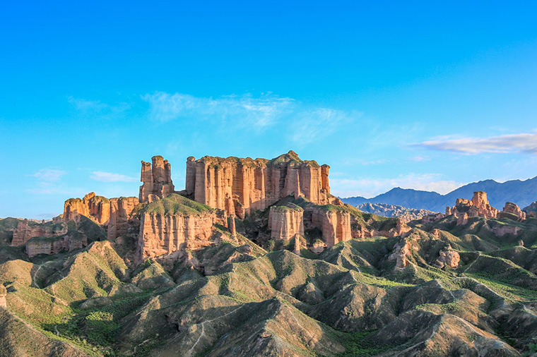 它是中國乾旱地區最為典型的丹霞地貌,同時也是中國發育最完整,造型最為奇特的丹霞地貌之一。以砂岩地貌遺跡景觀為主體,是國內窗櫺狀宮殿發育最好、規模最大的地質地貌遺跡,是窗櫺狀宮殿式丹霞地質命名地,被評為<窗櫺狀宮殿式丹霞地貌中國第一>景區內廣泛分佈丹霞崖壁、石牆、石柱、尖峰、丘陵等地貌形態,尖峭挺拔,連綿不斷,氣勢宏偉。