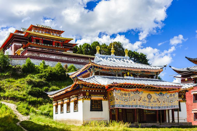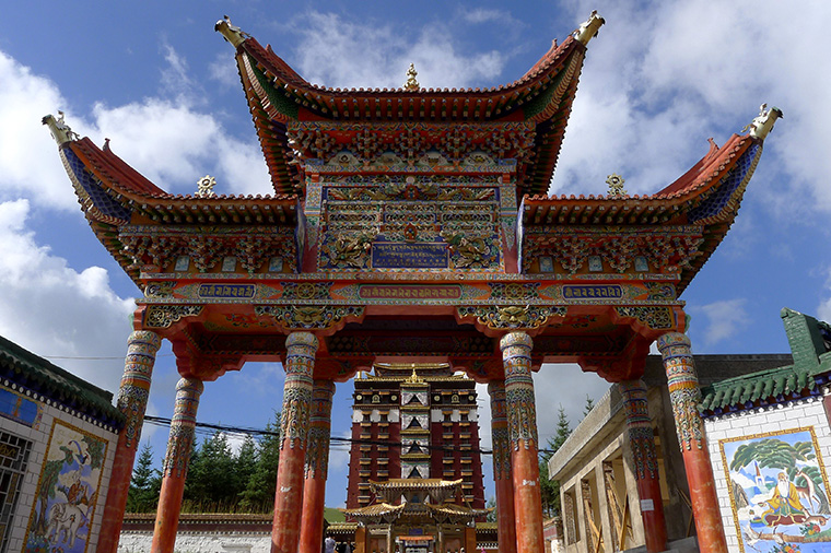 郎木寺即郎木寺鎮,是甘南藏族自治州碌曲縣下轄的一個小鎮。一條小溪從鎮中流過,小溪雖然寬不足2米,卻有一個很氣派的名字"白龍江",如按藏文意譯作"白水河"。小溪的北岸是郎木寺,南岸屬於四川若爾蓋縣,屬於甘肅的"安多達倉郎木寺"和屬於四川的"格爾底寺"就在這裡隔"江"相望。一條小溪分界又聯結了兩個省份,融合了藏、回兩個和平共處的民族;喇嘛寺院、清真寺各據一方地存在著;曬大佛,做禮拜,小溪兩邊的人們各自用不同的方式傳達著對信仰的執著。周圍被草原、樹林、山丘、紅色的石崖圍繞,環境優美,有“東方小瑞士”之稱。小鎮中心的馬路兩段鋪設了不同顏色的石板,兩種石板之間便是省界,可以在這裡體驗“一步跨省”的神奇體驗。