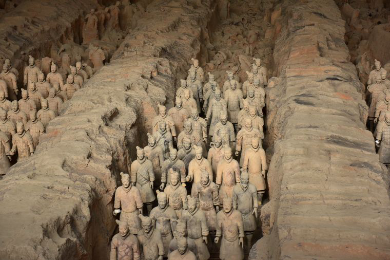 世界第八奇蹟,1974年西安市臨潼區村民在打井時發現了大大小小的殘俑,由此秦始皇時期的政治經濟文化軍事狀況逐漸展示在世人的面前。1979年規模宏大的秦兵馬俑博物館隆重開放,舉世罕見的秦兵馬俑博物館開放後,很快就轟動了中外,被譽為"世界第八大奇蹟",是當代最重要的考古發現之一。秦兵馬俑以其巨大的規模,威武的場面,和高超的科學、藝術水準,使觀眾們驚嘆不已。重回時光隧道,2200年前的秦始皇建造了他永生的住所,我們一起來看看。目前開放1~3號坑及銅車馬坑。現場遺址的一級古蹟、是難得一見的。另1號坑後方考古學家仍在努力挖掘與修復,幸運的話您還可看到他們努力的發掘與修復文物的情況。