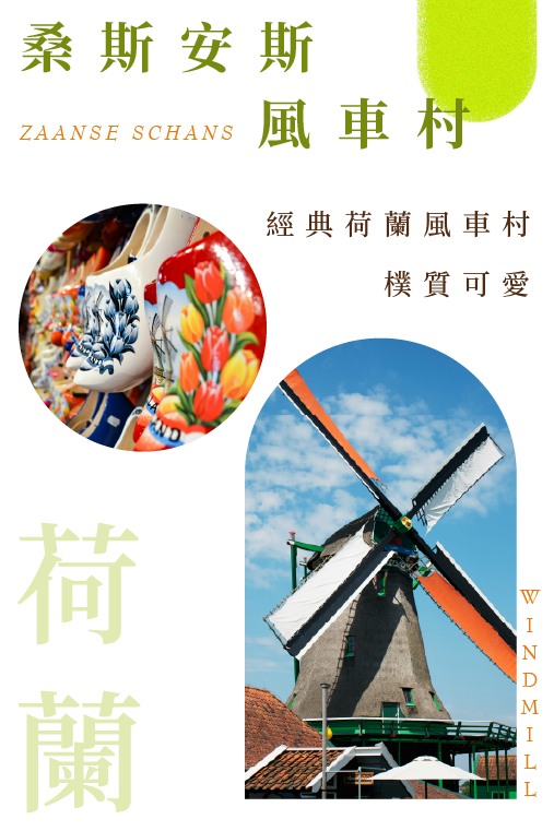 抵達後前往桑斯安斯風車村位於荷蘭阿姆斯特丹北方15公里,古老的建築生動描繪了17、18世紀的荷蘭生活。這裡至今還有居民居住,保留著古老的造船廠、製作木鞋工坊,還有風車,是一個仍有居民居住、開放式的保留區和博物館。漫步在風車村莊內,都可以欣賞到美麗的歐洲田園風光。一般遊客來這裡遊玩的主要目的就是參觀這裡的風車。除了遊覽風車外,你還可以參觀荷蘭木鞋工廠,奶酪作坊、船塢和白蠟商店等,這些地方每天都有傳統的手工技藝表演。你可以在木鞋工廠買一雙正宗的荷蘭木鞋,在奶酪作坊品嚐又香又濃郁的荷蘭奶酪,如果喜歡吃的話還可以買一些帶走。