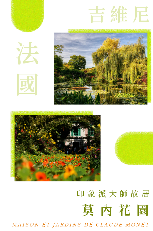 是一個充滿詩意的小鎮,小鎮長住人口只有幾百人,但每年吸引眾多旅客前來,原因無他,因為在100多年前,印象派大師-莫內居住於此,直至終老。莫內花園,印象派大師-莫內的故居,莫內故居陳設維持莫內居住時的原貌,花園的花草亦是按當時的植栽種植。莫內是在一次搭火車時,被這裡的美景所吸引,並移居至此,直到有能力買下房子及週圍土地,開始打造心目中的花園。其中幾幅著名的畫作就是在此創作的,如睡蓮池上的拱橋、睡蓮…等等。※莫內花園每年僅於4月至10月間開放參觀,如無開放則改參觀拉羅舍居伊翁城堡