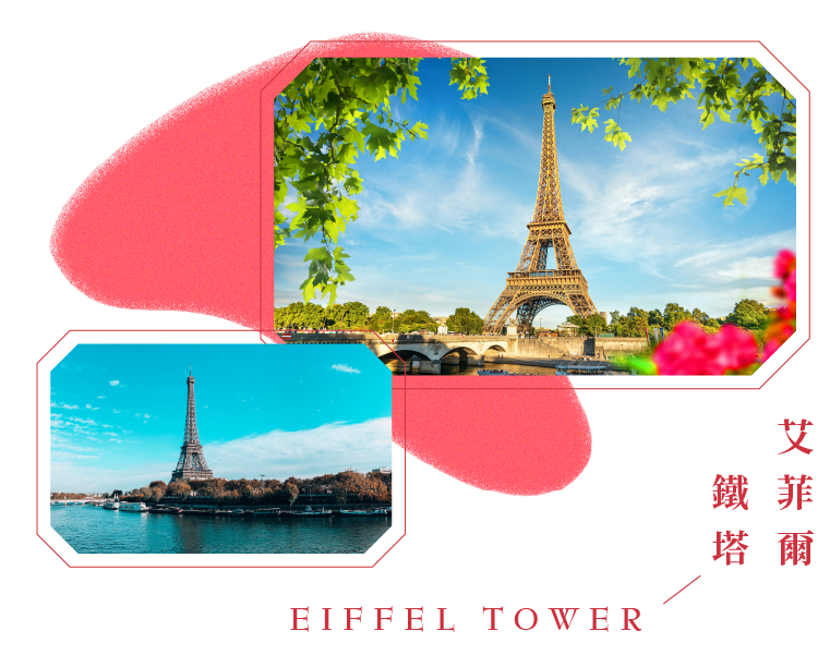 艾菲爾鐵塔從1887年1月27日起建,分為三樓,分別在離地面57.6米、115.7米和276.1米處,其中一、二樓設有餐廳,第三樓建有觀景台,從塔座到塔頂共有1,711級階梯,共用去鋼鐵7,000噸,12,000個金屬部件,250萬隻鉚釘,模仿人體的骨頭為建,極為壯觀屬於鏤空結構鐵塔,高300米,天線高24米,總高324米。艾菲爾鐵塔由250萬個鉚釘連接固定。於塔的四個面上共刻有72個法國科學家、工程師與其他知名人士的名字,居斯塔夫•艾菲爾以此來銘記他們做出的貢獻。