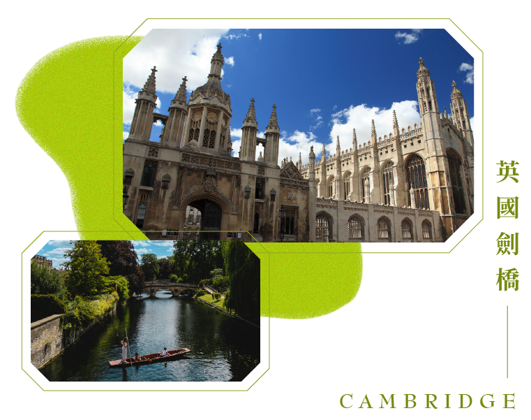 國王學院King's College:是劍橋大學最著名的學院,學院內的國王禮拜堂是劍橋建築的一大代表,也是中世紀晚期英國建築的重要典範;三一學院Trinity College:是劍橋大學最大的學院,現於三一禮拜堂外,還有一棵從牛頓家鄉移植來的蘋果樹,以紀念這位萬有引力之父;循著徐志摩的足跡,漫遊劍橋。