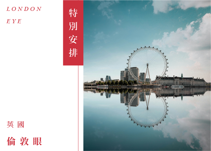 特別安排搭乘泰晤士河畔的千禧地標倫敦眼London Eye,這座高135公尺的巨型摩天輪是英國為了迎接千禧年而建,32個造型前衛的透明玻璃包廂,讓遊客可以360度從高處俯瞰倫敦市區景觀,登上倫敦眼將帶給您完全不同的視野,留下與眾不同的回憶。