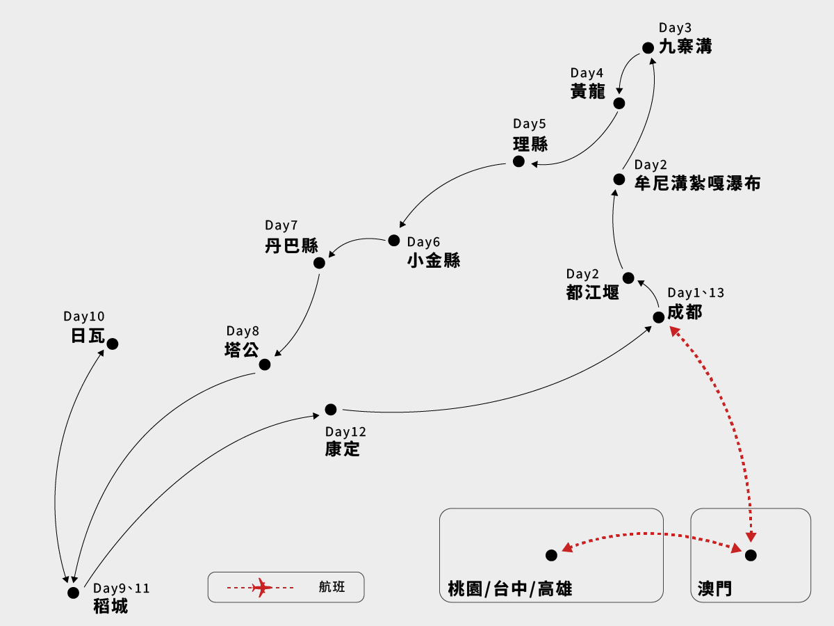 新都橋→天路十八彎觀景亭~剪子灣山~卡子拉山~理塘(長青春科爾寺)~海子山→稻城(桑堆小鎮、紅草地)→日瓦