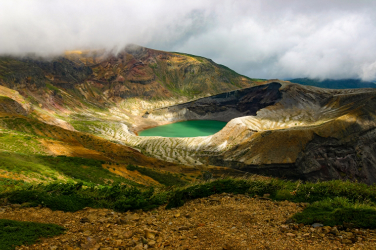 名列日本百絕景的「藏王御釜」,是因火山口形成的湖,站在火山地貌觀賞,如遺落山中的一顆綠寶石,湖面色彩會根據季節或天氣呈現不同樣貌。
