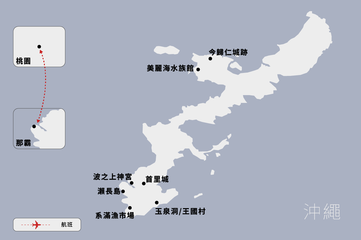 集合於桃園國際機場,辦理出國手續後,即搭乘豪華客機飛往日本最南端之島嶼~有東方夏威夷之稱浪漫多情的~沖繩【琉球】