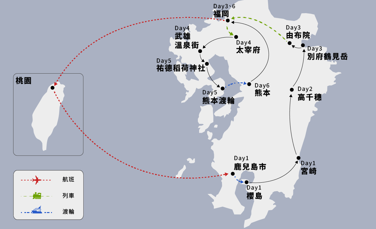 桃園/鹿兒島空港(航班)→磯庭園【仙巖園】→櫻島火山~有村熔岩展望台~櫻島熔岩海濱公園足湯渡輪~錦江灣渡輪(鹿兒島港-櫻島港)→宮崎