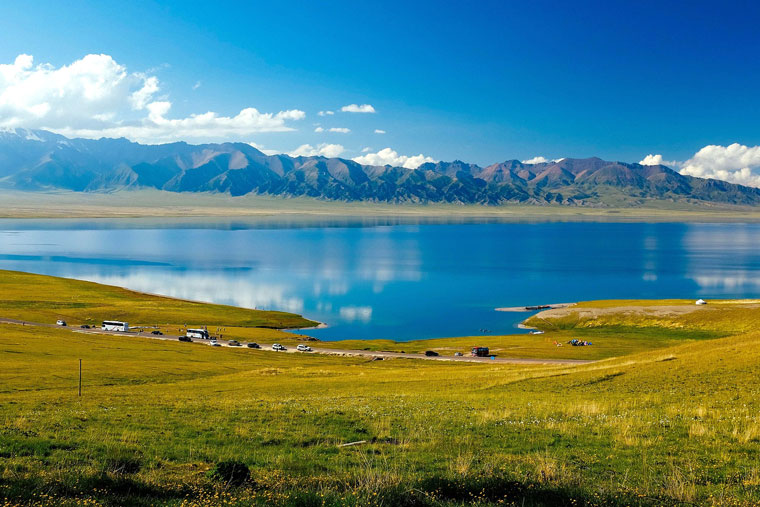 大草原像柔軟的綠絲綢,鋪得又滿又廣,看不見邊際;頭頂藍天白雲,潔白的雲朵彷彿觸手可及,遠處還有經久不化、巍峨壯觀的雪山作背景。搭乘觀光車,穿梭在草原各個角落,領略不同的美景。