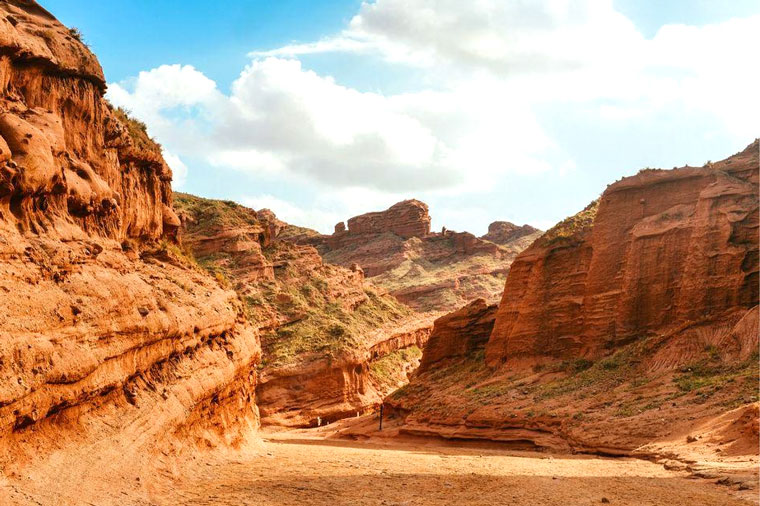 新疆之大,佔據中國六分之一國土面積;新疆之奇,在地表溫度真如火焰的火焰山,同樣也在岩壁宛如火焰的地形上。我們將前往天山神秘大峽谷,位於217國道北側,海拔1600公尺。一眼望去,一片龐大的紅色山體群,在烈日下宛如燃燒的火焰,經過億萬年的風剝雨蝕、洪流沖刷,山體形成具象化的怪石,如大象臉、如布達拉宮...奇趣豐富,難怪曾入選國家地理「全球最美十大峽谷之一」。