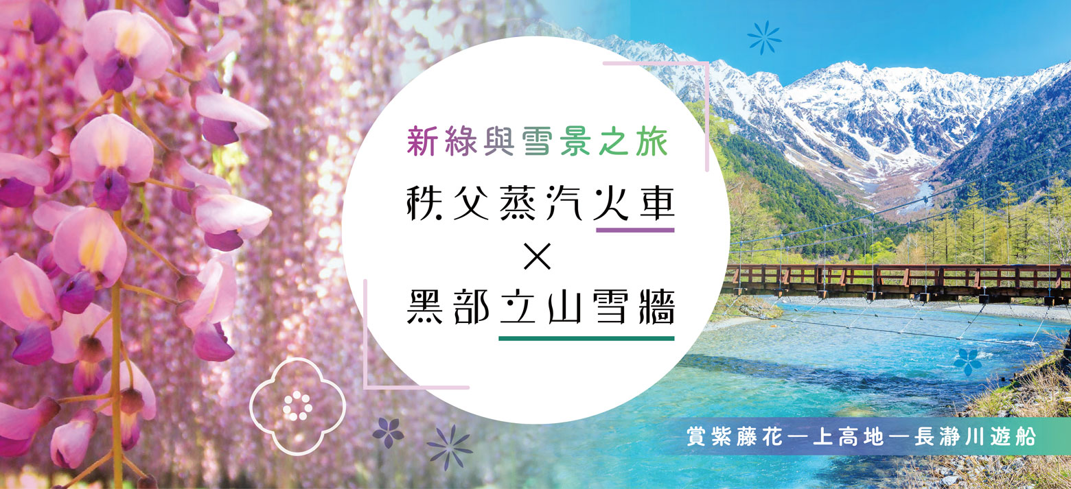 2026/05/11(一) | 桃園國際機場出發 秩父蒸汽火車與黑部立山雪牆7日│長瀞川遊船+紫藤花+上高地機位 35 候補0 已售6 可售28秩父蒸汽火車、黑部立山、雪牆、長瀞川遊船、紫藤花、上高地 |