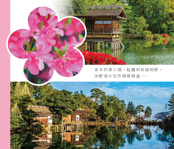 五月的兼六園恰逢新綠最鮮明的時節,嫩葉在陽光下泛著柔亮光澤,杜鵑花悄悄點綴園中,將湖畔染上一抹粉紅。穿過古橋與茶屋,微風拂過水面,整個庭園散發著初夏清爽而雅致的氣息。