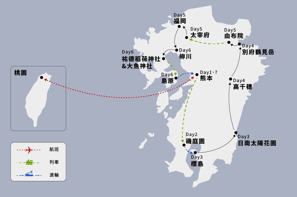 集合於台灣桃園國際機場,由專人辦理出境手續,搭乘豪華客機,飛往日本九州熊本。