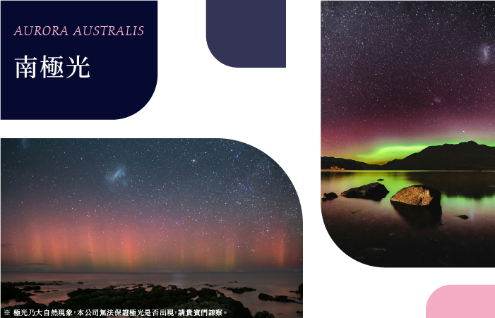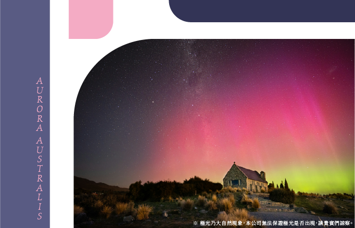說到極光,不只有北極光,南半球的「南極光 Aurora Australis」更顯得神秘而夢幻! 2024~2026 正值南極光活躍的「極光大年」,只要在 4~9 月前往紐西蘭,就很有機會遇見來自宇宙的光影奇蹟。紐西蘭南島本身就是一座大自然的地理教室。高山經歷多次冰河期切割, 形成壯麗的尖峰、深邃峽灣與湖泊,再加上大片原始溫帶雨林,景色震撼又多變, 是觀賞南極光最浪漫的舞台。