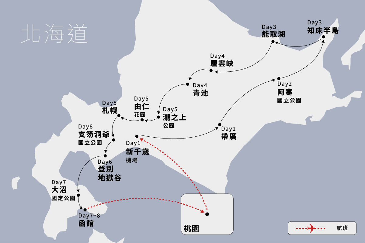 今日集合於桃園國際機場,搭乘豪華客機飛往日本北海道千歲機場,抵達後前往帶廣。